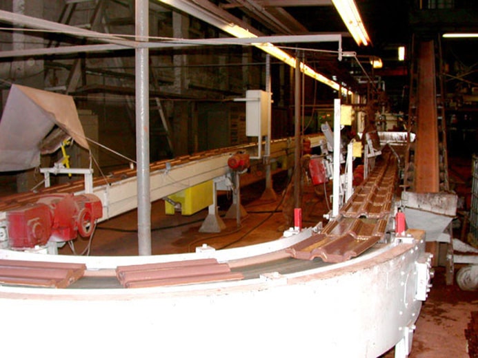 Формы-подложки для черепицы циркулируют по кольцевой линии. В определенный момент уже обожженная черепица снимается с подложки, и подложка направляется на новый круг наполнения сырьем, а черепица идет дальше.